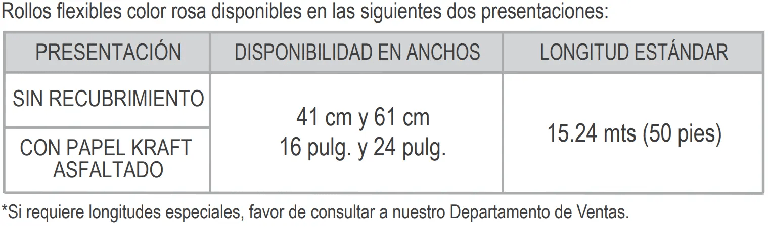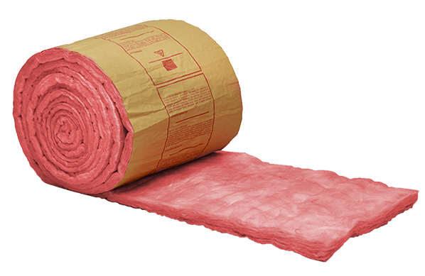 Aislamiento termoacústico fabricado con fibra de vidrio de baja densidad, aglutinada con resina fenólica de fraguado térmico, presentado en rollos de color rosa ya sea sin recubrimiento o con papel kraft asfaltado.