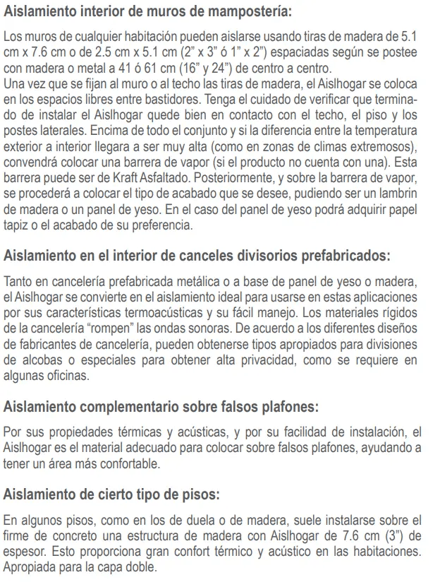 El Aislhogar se recomienda como aislamiento térmico y acústico en el ramo de la construcción, en usos como: