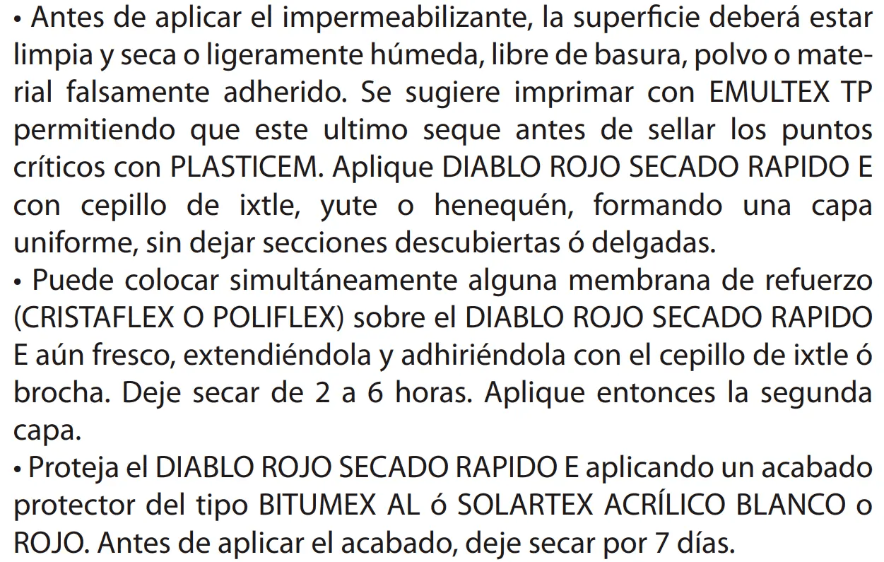 En reparaciones menores y aplicaciones a una sola capa sobre losas de concreto monolítico secas o ligeramente húmedas, con pendiente mínima del 2 al 3%, donde no se formen charcos, puede también usarse en muros de block para reducir la permeabilidad de estos. La vida útil de este producto puede llegar hasta 3 años.